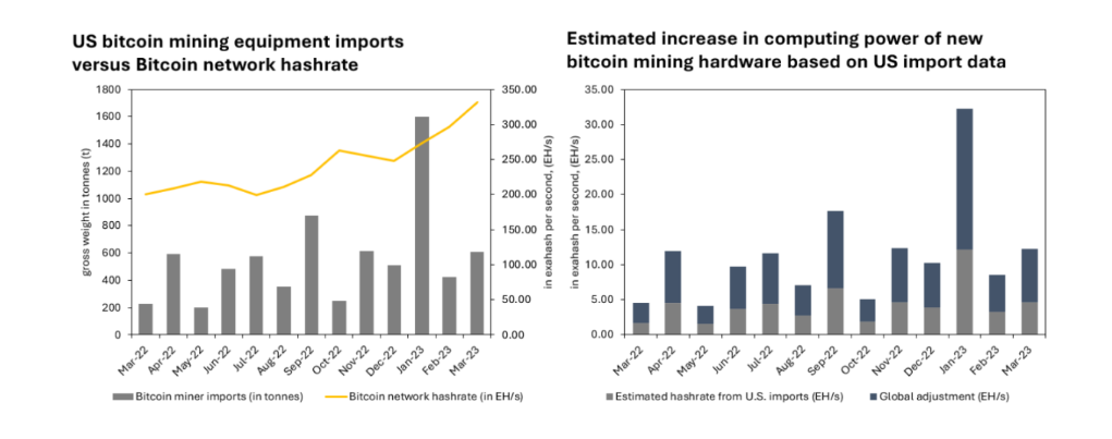 Neumeller then explained how his team began comparing hashrate increases with United States import data reflecting recent Bitcoin mining hardware deliveries. This was combined with an examination of publicly available sales data from mining hardware manufacturer Canaan.